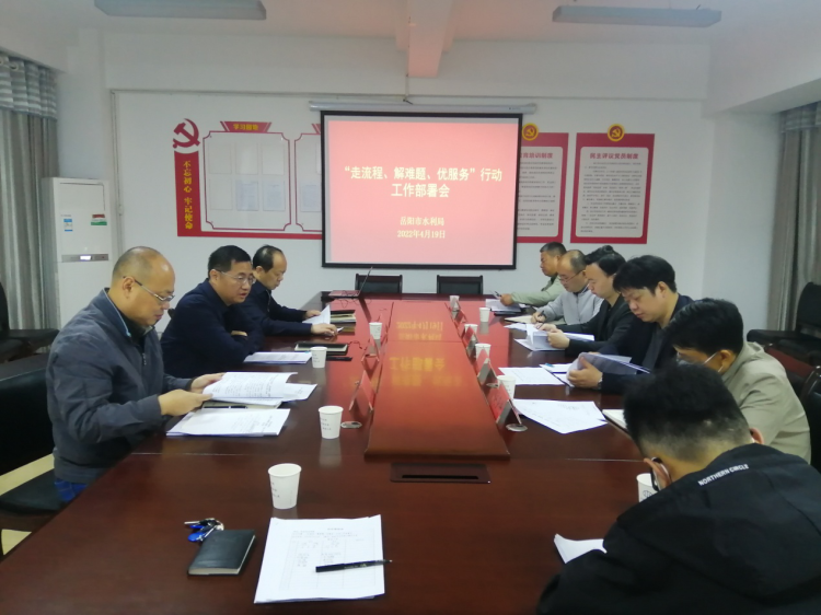 4月19日,市水利局党组书记、局长何晖主持召开“走流程、解难题、优服务”行动工作部署会,局党组成员、副局长丁文奇及相关科室单位负责人参加会议。