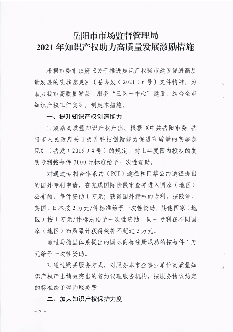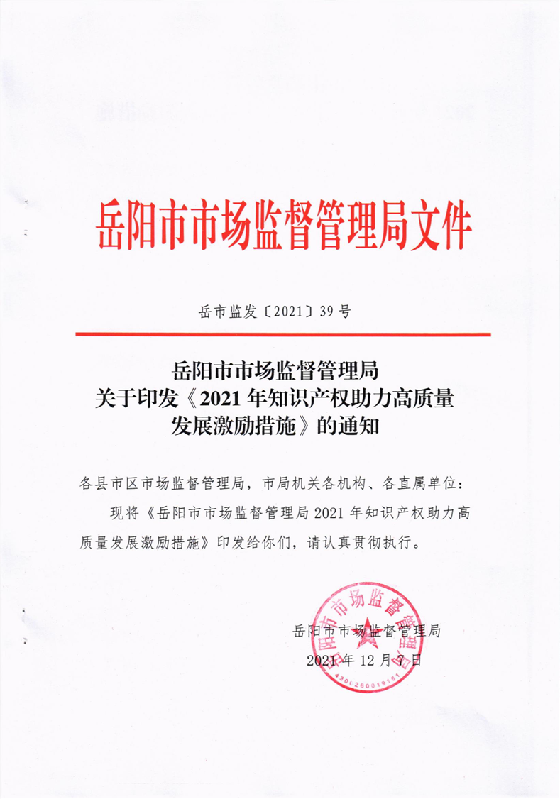 岳阳市市场监督管理局2021年知识产权助力高质量发展激励措施