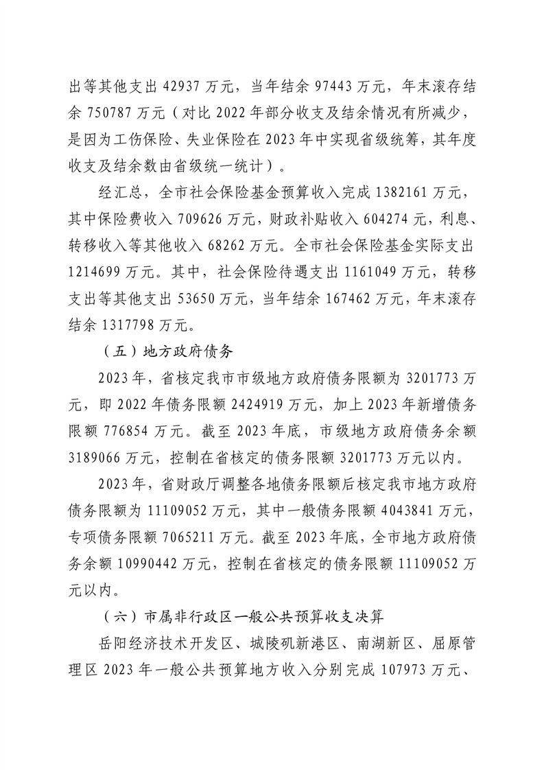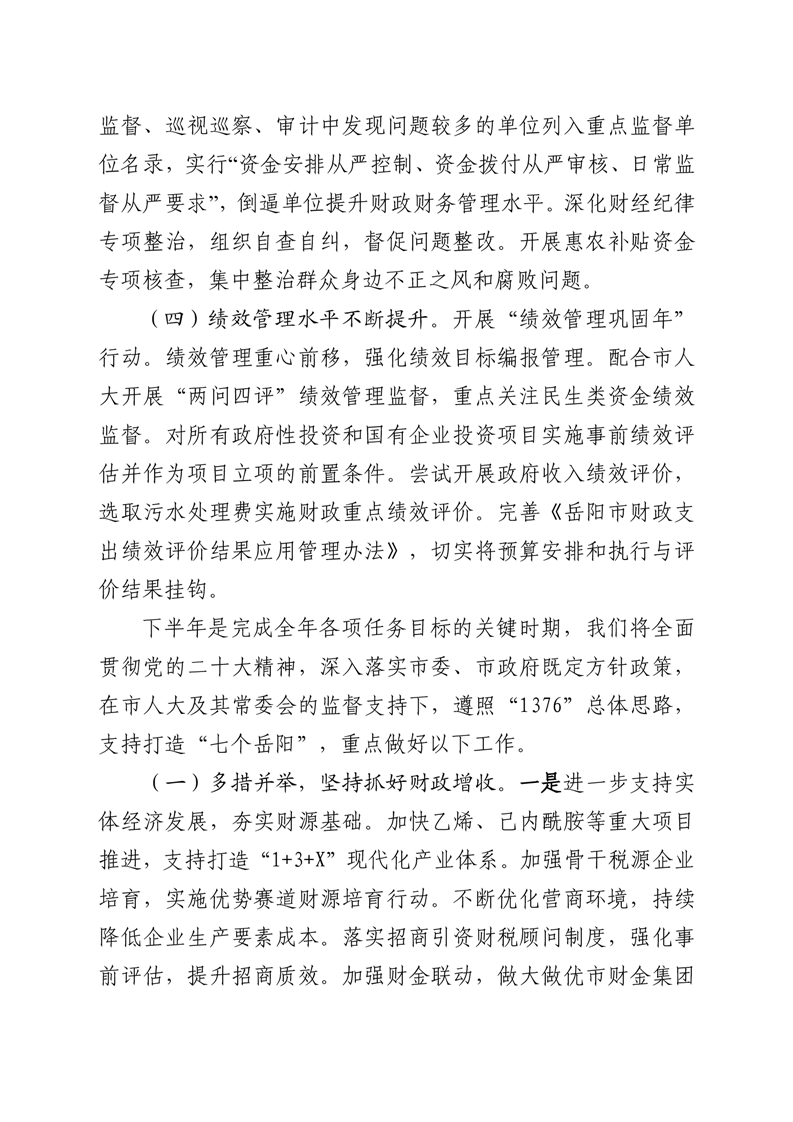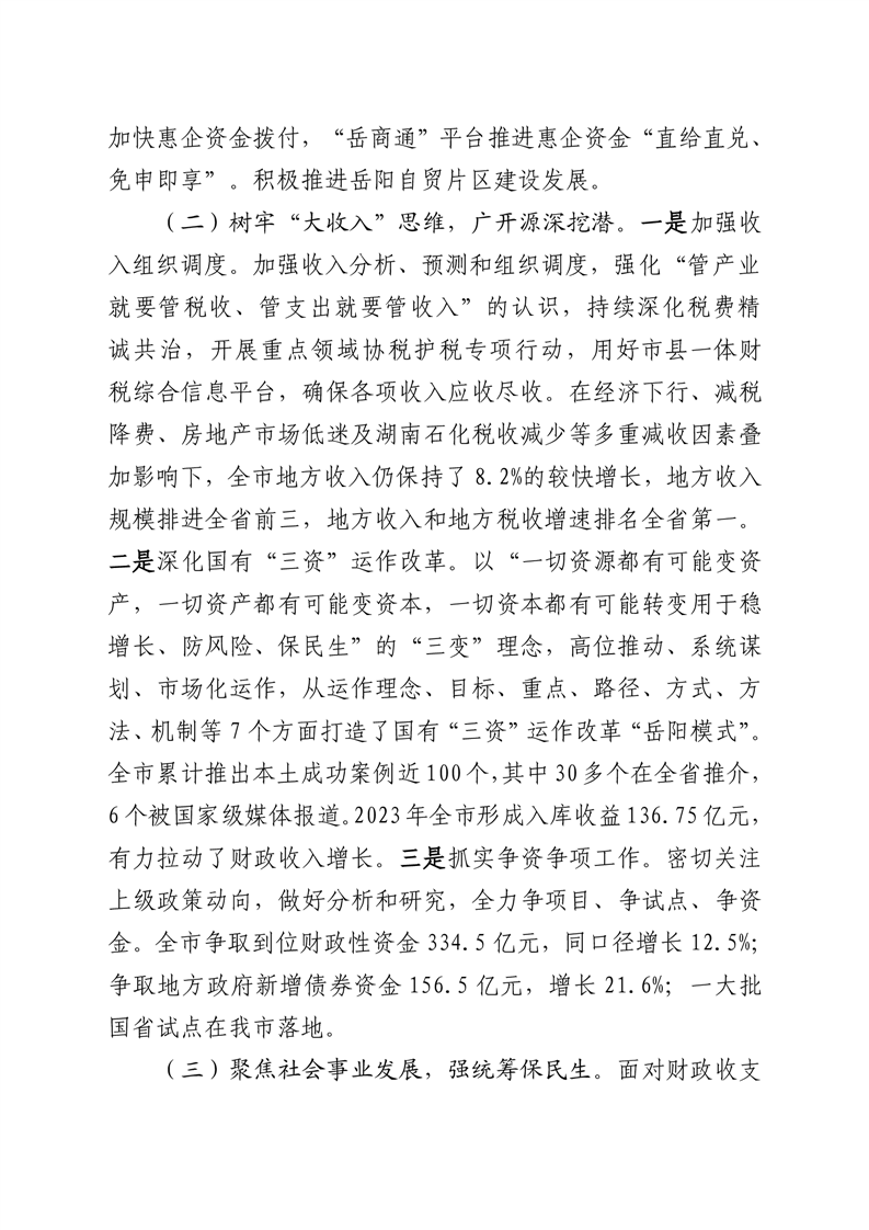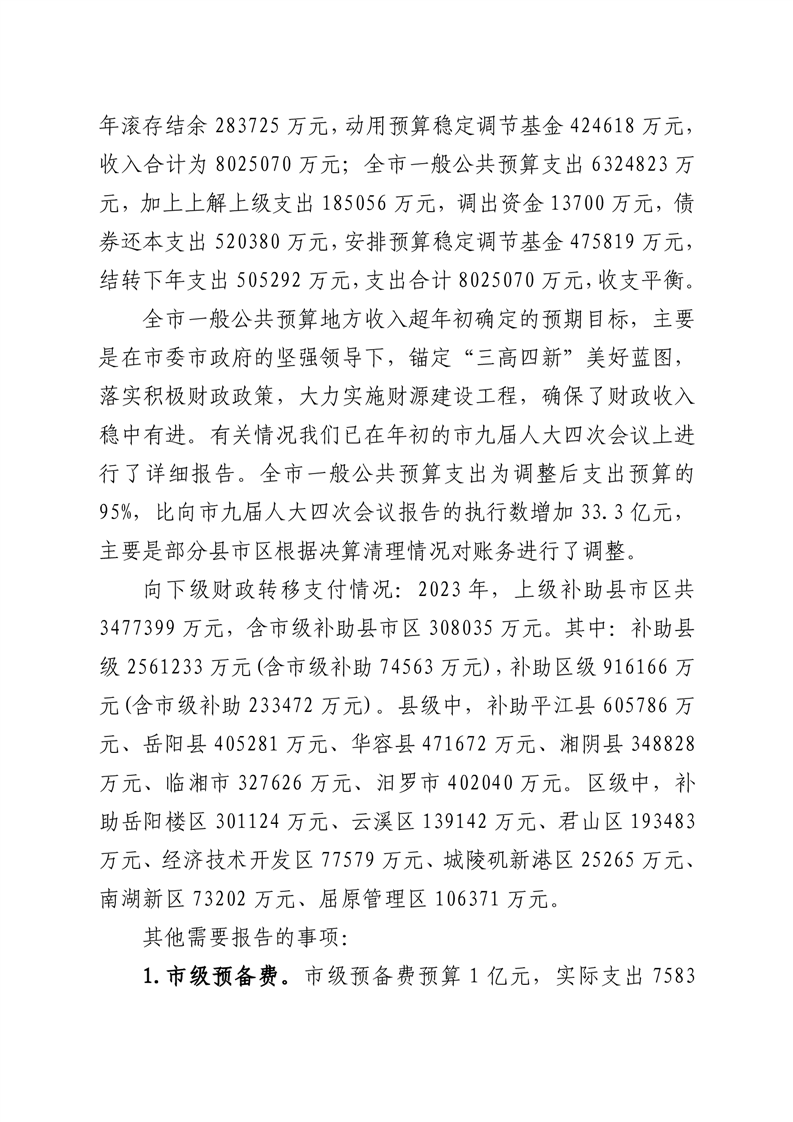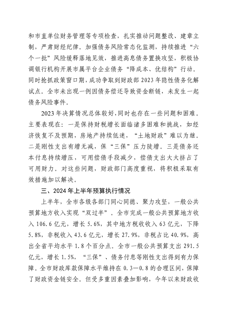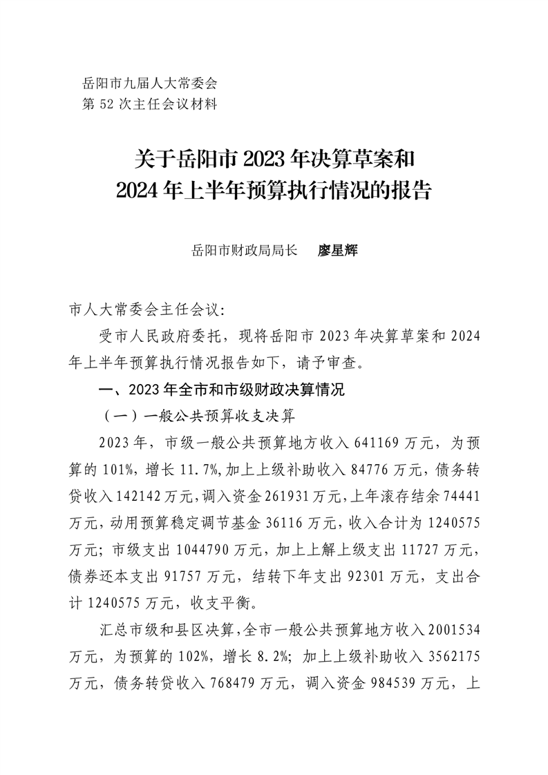第一部分:关于岳阳市2023年财政决算草案和2024年上半年预算执行情况的报告