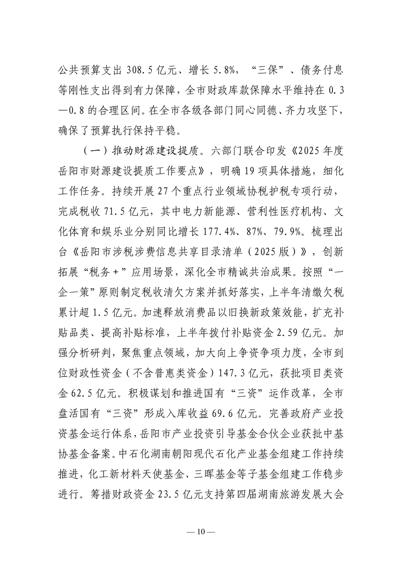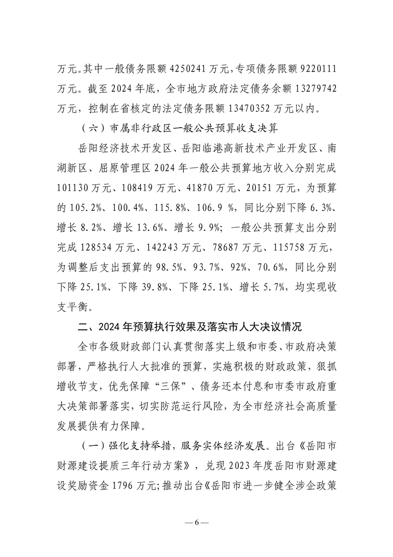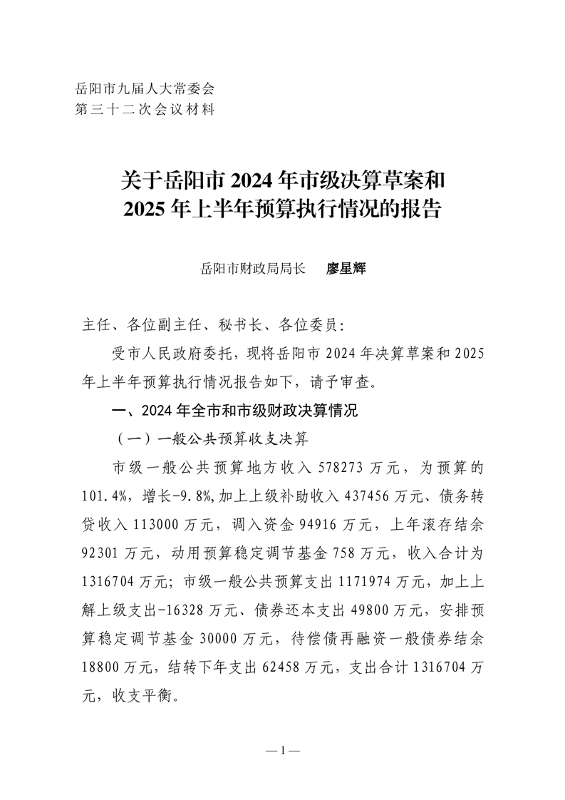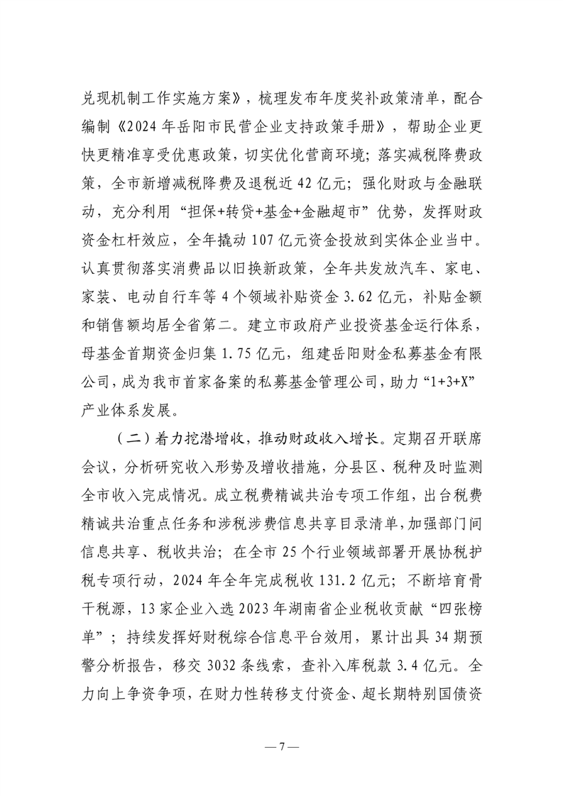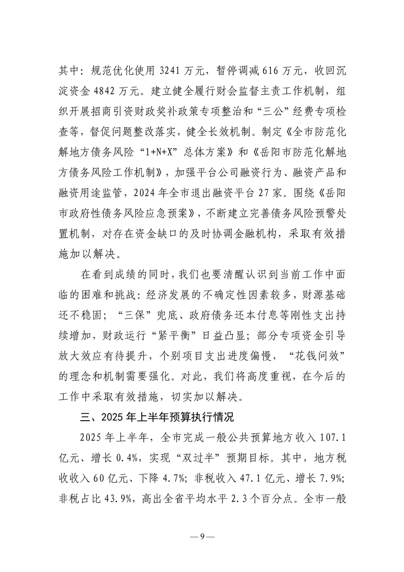第一部分:关于岳阳市2024年财政决算草案和2025年上半年预算执行情况的报告
