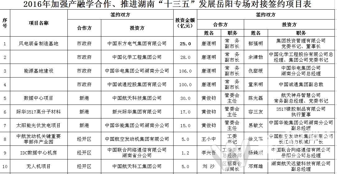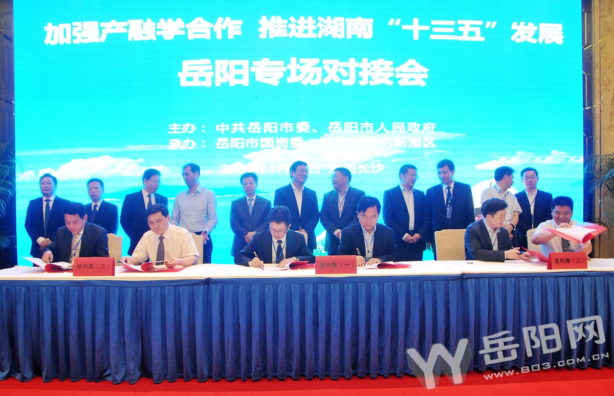 作为“加强产融学合作,推进湖南‘十三五’发展座谈会”活动的首场对接会,岳阳市与30余家央企进行了良性互动,就进一步加强合作交流,发展共赢达成了广泛合作意向。其中,中国诚通控股集团公司等4家企业与岳阳市政府签订战略合作框架协议,中科院计算技术研究所等18家企业、金融机构和科研院校与岳阳市各县市区及有关企业签订了项目落地协议,共签约资金625.5亿元。